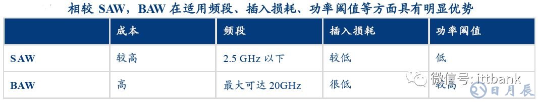 SAW濾波器頻率上限為2.5~3GHz。>1GHz時,其選擇性降低。在約2.5GHz處,其僅限于對性能要求不高的應(yīng)用。BAW濾波器更適合于高頻。同時還有對溫度變化不敏感,具有插入損耗小、帶外衰減大等優(yōu)點(diǎn)。與SAW、TC-SAW濾波器一樣,BAW濾波器的大小也隨著頻率增加而減少。