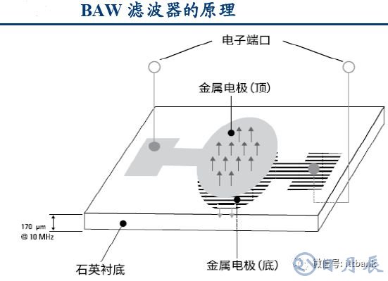 BAW濾波器基本結(jié)構(gòu)是兩個金屬電極夾著壓電薄膜(如石英),聲波在壓電薄膜里震蕩形成駐波(standing wave)。板坯厚度和電極質(zhì)量(Mass)決定了共振頻率。其壓電層厚度在幾微米量級,因此要在載體基板上采用薄膜沉積和微機(jī)械加工技術(shù)實(shí)現(xiàn)諧振器結(jié)構(gòu)。目前常用的BAW壓電材料有氮化鋁(AlN),鋯鈦酸鉛(PZT)、氧化鋅(ZnO)等。