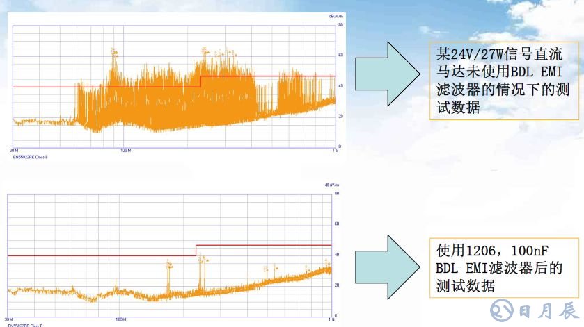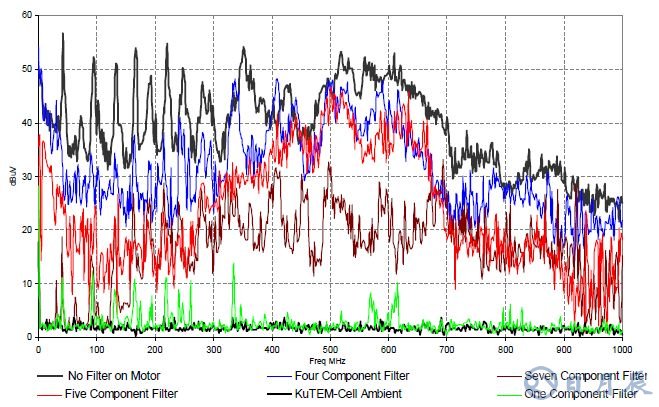 下圖顯示了27mm 12V直流電機(jī)在不同條件下的噪聲。加BDL濾波器時(shí)可以得到最低噪聲(圖中的青色波形)。