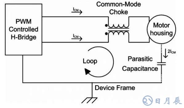 輻射和傳導(dǎo)發(fā)射的另一個(gè)來(lái)源可能來(lái)自驅(qū)動(dòng)電路。理想情況下,典型的H橋電路應(yīng)為電機(jī)提供恒定電流,但由于驅(qū)動(dòng)電路中電流的快速和頻繁切換,該電流具有快速上升時(shí)間尖峰。另一個(gè)重要問(wèn)題是通常電機(jī)離驅(qū)動(dòng)器很遠(yuǎn),這會(huì)在電機(jī)引線和設(shè)備框架之間產(chǎn)生相當(dāng)大的環(huán)路面積。輻射電位是環(huán)路面積的直接函數(shù);環(huán)越大,EMI噪聲越大。
