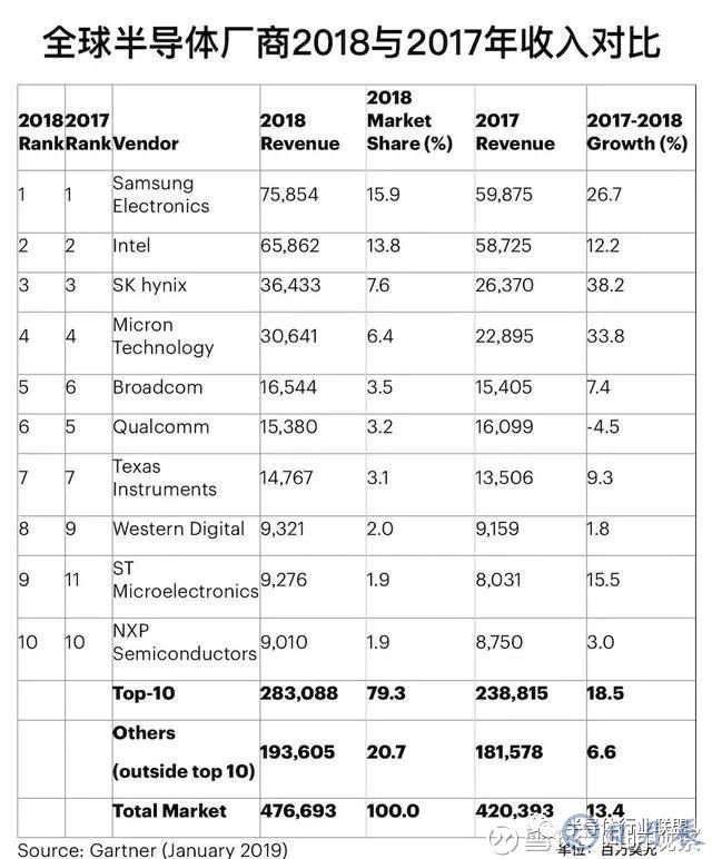 2019年1月7日,Gartner關(guān)于全球半導(dǎo)體廠商2018年收入的數(shù)據(jù)公開之后,三星電子以15.9%的市場份額,繼續(xù)穩(wěn)住了全球半導(dǎo)體產(chǎn)業(yè)中廠商年收入排名第一的地位。
