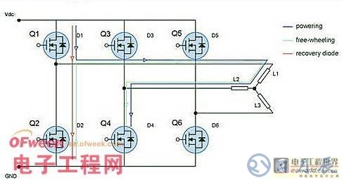 標準的三相功率級(power stage)被用來驅(qū)動一個三相無刷直流電機,如圖1所示。功率級產(chǎn)生一個電場,為了使電機很好地工作,這個電場必須保持與轉(zhuǎn)子磁場之間的角度接近 90°。六步序列控制產(chǎn)生6個定子磁場向量,這些向量必須在一個指定的轉(zhuǎn)子位置下改變。霍爾效應傳感器掃描轉(zhuǎn)子的位置。為了向轉(zhuǎn)子提供6個步進電流,功率級利用6個可以按不同的特定序列切換的功率MOSFET。下面解釋一個常用的切換模式,可提供6個步進電流。