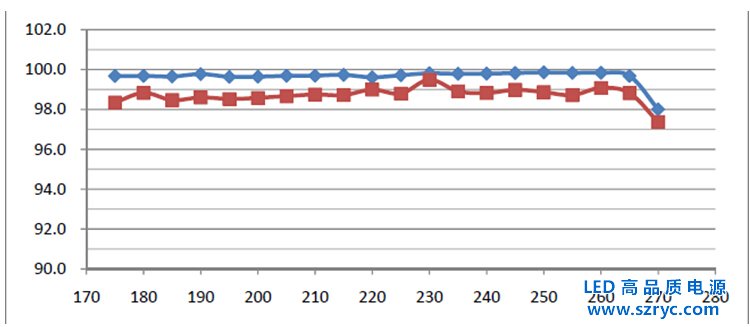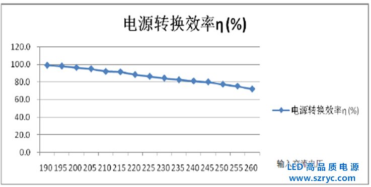 雖然我們只測(cè)了某一家公司、某一種產(chǎn)品的冷熱光效的區(qū)別。可能有人會(huì)提出這是以點(diǎn)代面,不夠全面的意見(jiàn)。假如從數(shù)據(jù)的準(zhǔn)確程度來(lái)說(shuō)的確是這樣,然而如果用數(shù)據(jù)的大致結(jié)果來(lái)說(shuō),這些結(jié)果是有很大代表性的。其實(shí)道理很簡(jiǎn)單,造成冷熱光效的區(qū)別的主要原因就是因?yàn)榘训托实暮懔髟醇傻搅撕凸庠丛谝黄鸬匿X基板上,這樣就造成了LED的結(jié)溫比沒(méi)有恒流源的結(jié)溫要高,所以它的熱光效就一定低。對(duì)于開(kāi)關(guān)電源來(lái)說(shuō),它的效率是有可能達(dá)到95%的,可是由于開(kāi)關(guān)電源元件多,體積大,是不可能集成到鋁基板上去的。所以目前所有集成到鋁基板上去的都只能是線性電源。當(dāng)然線性電源的種類也有不少,現(xiàn)在用得最多的就是一種分段點(diǎn)亮的無(wú)電解電容光引擎,還有就是直接采用恒流二極管的有電解或無(wú)電解電容的光引擎,但是不管是哪一種線性電源,它的效率曲線都是完全一樣的,都是隨著市電電壓的增加而直線降低,在220Vac時(shí)都是在85%左右(見(jiàn)下圖)。