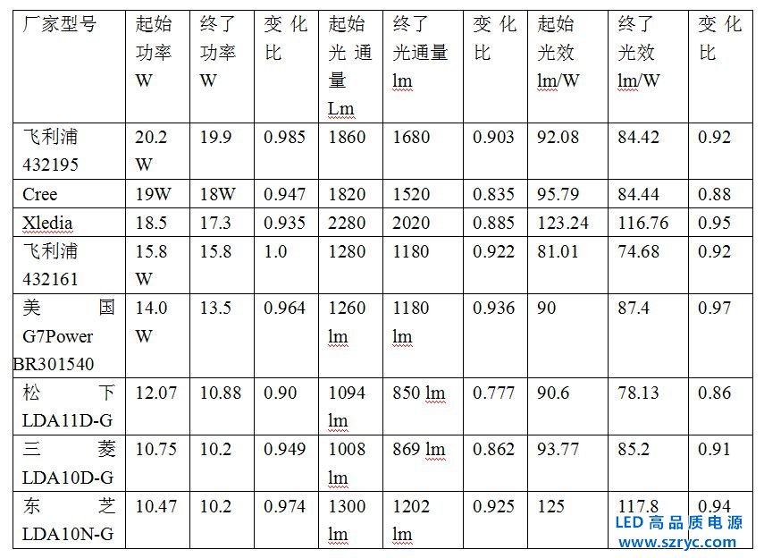 (1)所有各品牌LED燈具的光效起始值和終了值都是不同的。