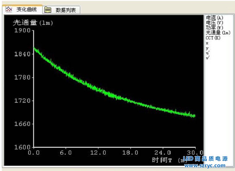 例如飛利浦公司的432195型球泡燈的輸出流明,在半小時(shí)后,從1860lm降低至1680lm,降低至92%。具體流明下降過(guò)程如下圖所示。