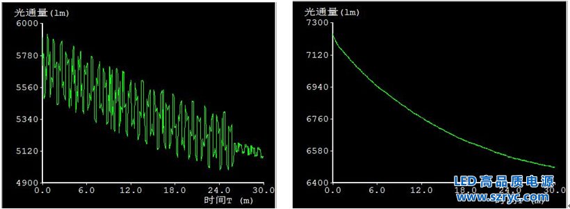 在測(cè)試時(shí)采用了同樣的散熱器,以免由二者散熱的不同而影響測(cè)試的結(jié)果。這兩種光引擎的總光通量隨時(shí)間的變化結(jié)果如下: