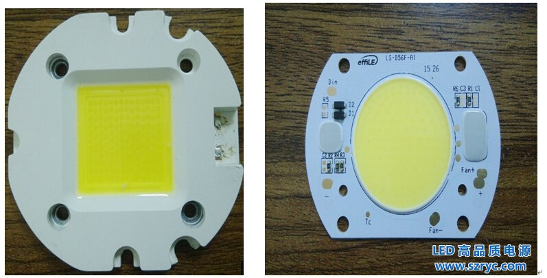 我們測(cè)試了一家深圳公司生產(chǎn)的60W無(wú)電解電容光引擎,以及埃菲萊公司生產(chǎn)的60W有電解電容光引擎。二者的外形照片如下: