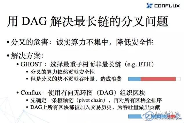 但是 GHOST 協(xié)議有一個缺點:雖然說它可以把帶寬用得比較充分,但同時浪費也很嚴重。 因為那些最終沒有被確定在最重子樹那條鏈上的區(qū)塊,它們里面的交易都是不算數(shù)的。大家挖到了一些區(qū)塊,但是最后都沒有加入共識,這些區(qū)塊的吞吐量就被浪費掉了。而我們的Conflux 其實和 GHOST 用了比較相似的方式去確定一條樞軸鏈,等確定好以后,我們再把所有的區(qū)塊排一個順序,這樣所有區(qū)塊里邊的交易都會對整個系統(tǒng)的吞吐量作出貢獻。當然排過順序以后,還需要把里邊有沖突的或者重復的交易去做一些處理,沖突的交易肯定不能都執(zhí)行。如果我們從帶寬的角度去解釋的話, GHOST 這個協(xié)議可以把帶寬利用得非常好,但它整個系統(tǒng)的開銷比較大,因為傳輸過很多沒有被加入共識的區(qū)塊,會浪費掉一些帶寬。