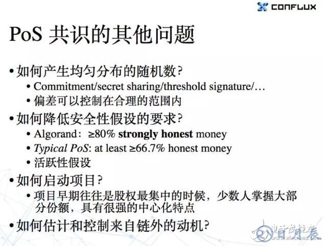 基于 PoS 的共識系統(tǒng)還有一些其他問題。通常我們?nèi)绻x擇一個小的委員會,如果不用 DPoS 的話,在 PoS 系統(tǒng)里我們需要隨機地去選。PoW 投票里的隨機性主要是由大家分布式并行挖礦時候的運氣帶來的,因為求解 PoW 問題本身有內(nèi)在的隨機性。但如果說我們要用隨機性去選擇一個投票委員會的話,就又要解決一個新的問題:怎么樣去產(chǎn)生一個公平的隨機數(shù)?