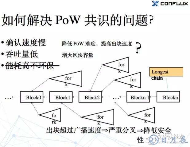 第一個是說確認速度慢。以比特幣為例,出一個塊平均要十分鐘,確認的話還要再等六個塊,就平均要一個小時。第二個是吞吐量比較低,大家都很清楚,比特幣在這點上已經(jīng)被人批評好幾年了。然后第三點就是能耗高不環(huán)保。但是第三點,既然我們要用PoW,這點能耗是避免不了的,所以我們也就不想著去解決這個問題了。