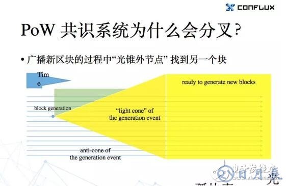 這個也不是的。我們用圖里邊每條線表示是一個節(jié)點,向右的這個箭頭表示的是時間。當這個節(jié)點產(chǎn)生一個區(qū)塊的時候,它需要把區(qū)塊廣播出去,但是廣播出去要消耗時間,所以會形成一個“事件光錐”。距離產(chǎn)生區(qū)塊的節(jié)點越遠,收到廣播過去的區(qū)塊所花的時間也越久,相應的要等到更晚的時間以后才能看到剛才生成的新區(qū)塊。也就是說只有在這個黃色區(qū)域及以后其他的節(jié)點才能看到你這邊產(chǎn)生的一個區(qū)塊。既然有光錐,相應的也就有光錐外的區(qū)域,也就是圖上綠色的部分。當一個節(jié)點處在這個光錐外區(qū)域的時候,他是不可能知道你這邊剛剛產(chǎn)生了一個區(qū)塊的,因為還沒有廣播過來。也就是說,如果網(wǎng)絡里產(chǎn)生的下一個區(qū)塊是在后邊黃色的這部分,那么當然很安全,因為這個時候所有的節(jié)點都看到最新的區(qū)塊了,然后他們再生產(chǎn)區(qū)塊都會跟在后面就不會出現(xiàn)分叉——如果大家都是好人的話。