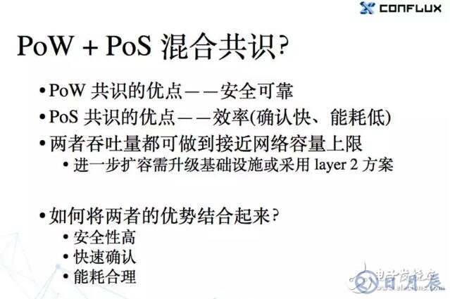 還有一種現(xiàn)在可能用的還不是很多的方式是 PoW 和 PoS 混合在一起做共識。因為 PoW 的優(yōu)點主要就是安全可靠,而 PoS 的優(yōu)點是效率高,特別是確認快,而且能耗比較低。如果能把這兩個的優(yōu)點結合在一起,就有可能設計出一個更理想的共識協(xié)議。同時大家還可以考慮用 DAG 的方式而不是鏈的方式組織區(qū)塊。因為 DAG 的方式不怕分叉,不需要過分限制出塊速度,所以大家可以出塊出得比較快,只要帶寬能同步就可以。