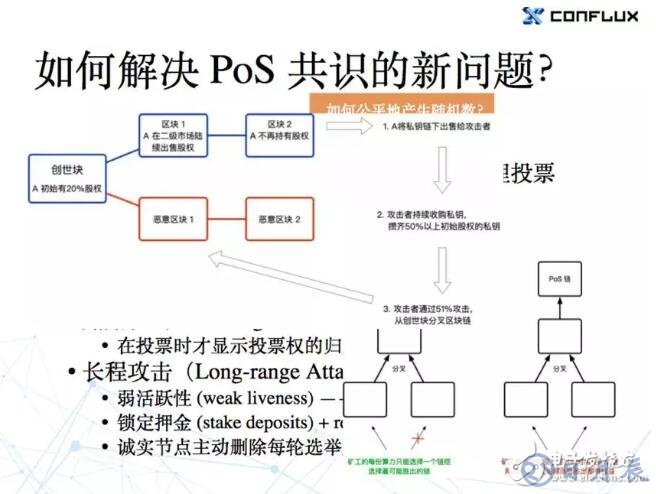 第一個優(yōu)點:礦工和持幣者的動機是一致的。PoS 的礦工都必須持幣,在整個的生態(tài)環(huán)境里減少了一個不持幣但靠機器來挖礦的角色。在 PoW 的社區(qū)中,經(jīng)常會出現(xiàn)有錢人、開發(fā)者、以及礦工三方的利益不是完全一致的情況,然后就會吵,以至于最后很多事很難辦成。到了PoS 中,現(xiàn)在至少礦工和資本家的利益會更為一致,一定程度上減少了沖突和分歧。