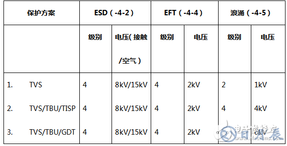 按照以上的規(guī)范要求和設(shè)計(jì)原則,下面我們提供三種不同級(jí)別的EMC防護(hù)解決方案,這些方案都已經(jīng)經(jīng)過(guò)了第三方獨(dú)立EMC兼容性測(cè)試的認(rèn)證。方案中用到的元器件包括: