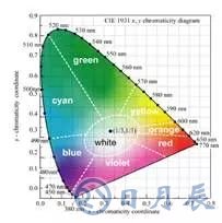 眾所周知,由紅(Red)、綠(Green)、藍(lán)(Blue)三基色可合成白光,如圖24所示。該圖為1931色度圖,三角形中央虛線(xiàn)區(qū)為白光區(qū)。氮化鎵LED一般只能發(fā)出一種顏色的光。白光照明也要通過(guò)RGB三基色的合成來(lái)實(shí)現(xiàn)。RGB三基色可以直接靠LED發(fā)射三基色光,也可用LED去激發(fā)熒光物質(zhì),通過(guò)二次光轉(zhuǎn)換獲得三基色光或準(zhǔn)三基色光。