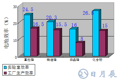 不同的半導(dǎo)體材料在實(shí)驗(yàn)室和產(chǎn)業(yè)中制成的太陽(yáng)電池效率