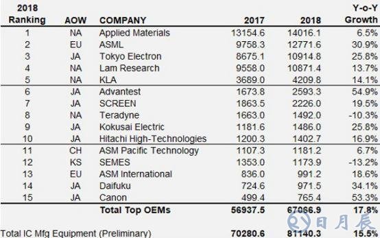 2018年的全球半導(dǎo)體生產(chǎn)設(shè)備廠商的銷售額排名Top15,銷售額的單位是百萬美金。(圖片來自:VLSI Research)