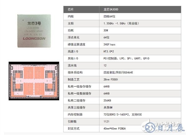 龍芯3A3000是龍芯3號(hào)系列處理器的最新升級(jí)產(chǎn)品,28nm FDSOI工藝制造,四發(fā)射亂序執(zhí)行GS464E微架構(gòu),12條流水線,64為四核心,主頻1.35-1.5GHz,每核心一級(jí)指令、數(shù)據(jù)緩存各64KB,每核心二級(jí)緩存256KB,共享三級(jí)緩存8MB,峰值浮點(diǎn)性能24GFlops,功耗30W,內(nèi)存支持DDR3-1600。