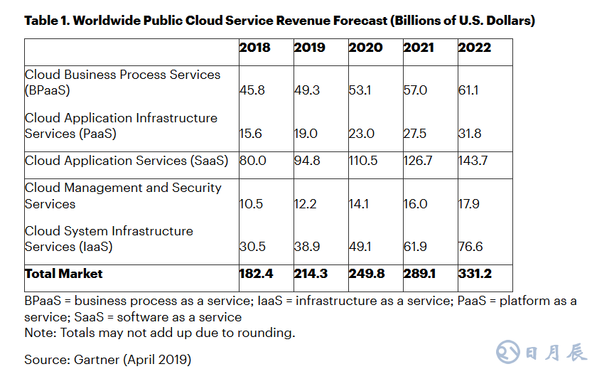 增長最快的分支市場是云系統(tǒng)基礎(chǔ)設(shè)施服務(wù)或基礎(chǔ)設(shè)施即服務(wù)(IaaS),預(yù)計(jì)2019年將增長27.5%,達(dá)到389億美元,高于2018年的305億美元(見表1)。云應(yīng)用基礎(chǔ)設(shè)施服務(wù)或平臺(tái)即服務(wù)(PaaS)將實(shí)現(xiàn)21.8%的增長率。