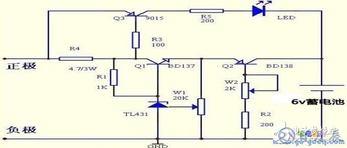輸入直流電壓高于所充電池電壓8伏即可。如圖3中R1、Q1、W1、TL431組成精密可調(diào)穩(wěn)壓電路,Q2、W2、R2構(gòu)成可調(diào)恒流電路,Q3、R3、R4、R5、LED為充電指示電路。隨著被充電池電壓的上升,充電電流將逐漸減小,待電池充滿(mǎn)后R4上的壓降將降低,從而使Q3截止,LED將熄滅。為保證電池能夠充足,在指示燈熄滅后繼續(xù)充(1—2)h。使用時(shí)給Q2、Q3裝上合適的散熱器。本電路的優(yōu)點(diǎn):制作簡(jiǎn)單,元器件易購(gòu),充電安全,顯示直觀,并且不會(huì)損壞電池。通過(guò)改變W1可以對(duì)多節(jié)串聯(lián)鋰電池充電,改變W2可以對(duì)充電電流進(jìn)行大范圍調(diào)節(jié)。缺點(diǎn)是無(wú)過(guò)電流放電控制電路。