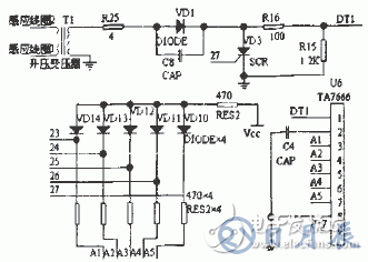 負(fù)載短路時(shí)。電線電流變得很大,使磁感線圈上產(chǎn)生的感應(yīng)電壓升得很高,這時(shí)。磁感線圈獲得的電壓遠(yuǎn)遠(yuǎn)大于0.15V,TA7666的3、4、5、6、7腳同時(shí)輸出低電平,控制過(guò)程與前述相同,電磁開(kāi)關(guān)立即切斷電源。保證用電戶電器設(shè)備的安全。3.3 超壓保護(hù)電路工作原理