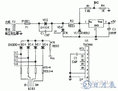 當(dāng)負(fù)載短路時(shí),電線電流突然升得很大,磁感線圈的感應(yīng)電壓也很高,這會(huì)燒毀家庭用電故障提示器。為了防止這種情況發(fā)生,儀器上設(shè)計(jì)有兩個(gè)保險(xiǎn)絲,同時(shí)儀器上還設(shè)計(jì)有兩個(gè)超壓保護(hù)電路。短路故障發(fā)生時(shí),TA7666的7腳為低電平,經(jīng)門(mén)電路使保護(hù)二極管的控制端為高電平。于是二極管短路導(dǎo)通。確保儀器安全。