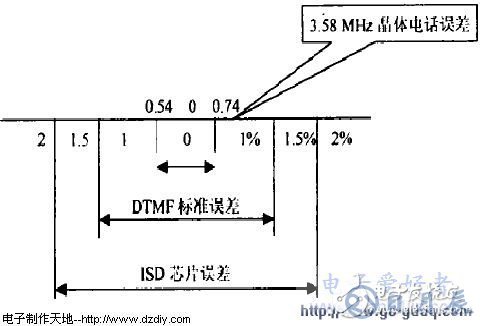當(dāng)89C51收到由天然氣、溫度和失竊報(bào)警器送來信號后,89C51采用將預(yù)錄在ISD25120語音芯片中的雙音頻電話號碼及報(bào)警語音播出的方式進(jìn)行報(bào)警。由于DTMF雙音多頻數(shù)字信號和ISD語音芯片在電話和無線網(wǎng)絡(luò)傳輸?shù)恼Z音信號頻率范圍相同,所以此方案可行。但要注意以下問題:貝爾電話DTMF、信號標(biāo)稱誤差是±1.5%,當(dāng)電話晶體為3.579 45 MHz時,產(chǎn)生的音調(diào)誤差范圍為+0.74%~-0.54%。而大部分ISD器件內(nèi)部振蕩器在全電壓和全溫度范圍內(nèi)誤差為2.25%,即:ISD器件誤差大于DTMF、標(biāo)準(zhǔn)誤差,如圖4所示。所以不能用ISD內(nèi)部振蕩器,而必須用外部晶體振蕩輸入信號。從圖4可以看出,最壞錄放音情況時,提供給ISD器件的外部時鐘要求誤差小于0.75%,他可以是TTL或CMOS電平。對于ISD25120采樣速率為4 kHz,提供的時鐘頻率為512 kHz,單片機(jī)為6 MHz晶體,工作頻率為1 MHz,外加二分頻電路提供給ISD25120的頻率為5 kHz,與要求的512 kHz很接近,使用中不會造成任何問題。這里要求頻率變化誤差要小,而并不要求非常準(zhǔn)確的頻率值。