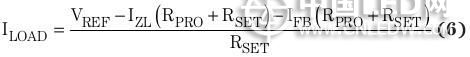 當(dāng)負(fù)載電流通路被移除時(shí),輸出電壓上升,直到齊納二極管 ZD1 開啟,同時(shí)電流流經(jīng) RPRO和 RSET接地。輸出電流由 RPRO和 RSET的串聯(lián)組合決定,因?yàn)?VFB受到驅(qū)動(dòng)后等于內(nèi)部帶隙參考電壓 VREF。因此,輸出保護(hù)電流默認(rèn)為: