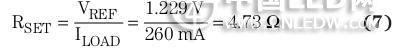 升壓轉(zhuǎn)換器經(jīng)過配置,用于驅(qū)動(dòng) 3 支高亮度白光 LED(260 mA)。典型參考電壓為 1.229 V 時(shí),將簡化的負(fù)載電流用于方程式7中,計(jì)算得到RSET: