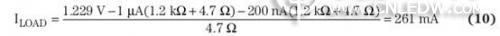 利用選擇的負(fù)載電流和保護(hù)電阻器,計(jì)算與預(yù)期負(fù)載電流的偏差(參見下列方程式 10)。數(shù)據(jù)表值200 nA用于反饋偏置電流 (IFB),1 ?A 值則用于預(yù)計(jì)的齊納二極管漏電流,VOUT約為 10V。
