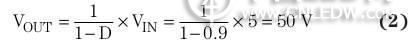 這種簡單實(shí)施方法存在的一個(gè)嚴(yán)重問題是,LED 串中出現(xiàn)的開路故障會(huì)移除負(fù)載電流的通路。當(dāng)沒有電流流過反饋電阻器 RSET時(shí),VFB被下拉至接地。作為響應(yīng),升壓轉(zhuǎn)換器會(huì)盡可能地增加其工作占空比至最大值,目的是在反饋 (FB)針腳上維持正確的電壓。利用理想化的升壓轉(zhuǎn)換器傳輸函數(shù)表明,當(dāng)轉(zhuǎn)換器接近其最大占空比時(shí),可以產(chǎn)生高輸出電壓 (VOUT)。請思考一個(gè)90%(常用值)典型最大占空比且 5V 輸入的升壓轉(zhuǎn)換器: