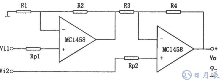 如圖所示為從同相端輸入的兩運放減法電路。