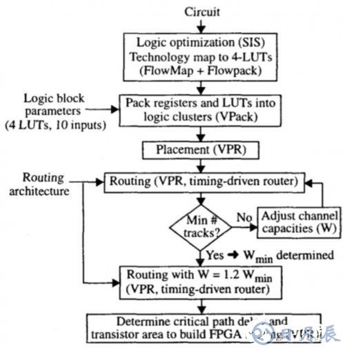 FPGA 的架構(gòu)研究是非常復(fù)雜的,有的時(shí)候即使是為了回答最簡單的問題,都需要付出相當(dāng)程度的努力。在很多情況下,F(xiàn)PGA 架構(gòu)師會(huì)認(rèn)為他們的一些新想法,諸如更大的邏輯塊、新型的進(jìn)位鏈等等,理應(yīng)會(huì)極大的提升系統(tǒng)的功耗、性能、面積、穩(wěn)定性等指標(biāo)。然而,為了證明這些想法的可行性,就需要設(shè)計(jì)工具和實(shí)際應(yīng)用來對這些想法進(jìn)行驗(yàn)證。同時(shí),也需要結(jié)合很多和這些想法無關(guān)的 FPGA 架構(gòu)細(xì)節(jié),以組成一個(gè)完整的系統(tǒng)。在工具層面,大名鼎鼎的 Pathfinder 和 VPR 的出現(xiàn),已經(jīng)為大多數(shù)邏輯映射工作提供了一個(gè)穩(wěn)定而高效的后端平臺(tái)。