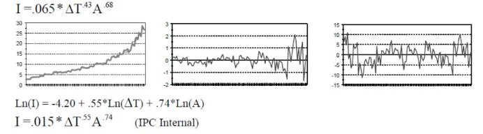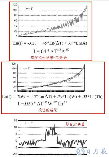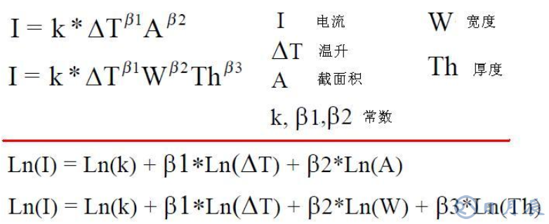我們直觀的認識認為發(fā)熱一般從R*I^2,R是和導(dǎo)線的截面積(寬度和厚度的乘積),因此我們可以發(fā)現(xiàn)這是一個非線性函數(shù),并且由于導(dǎo)線在發(fā)熱的同時有多種散熱方式,使得這個模型變得比較復(fù)雜,因此我們初步給定一個模型然后使用數(shù)據(jù)進行擬合