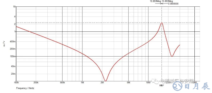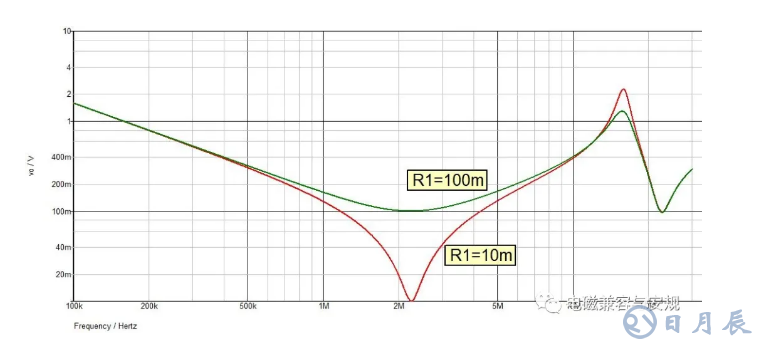 (2)增大電容的寄身電阻ESR,減小并聯(lián)諧振的品質(zhì)因數(shù),如將C1電容的ESR由10m歐變?yōu)?00m歐,仿真結(jié)果如下圖所示。