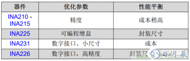 對于對性能要求較高的 應(yīng)用, INA210-215 系列器件具有較低的偏移(最大 35μV)和增益誤差(最大 1%)。如果需要使用數(shù)字接口實現(xiàn)高精度電流監(jiān)測,INA226具有 最大 10 μV 的偏移以及 0.1% 的增益誤差。如果需要小型數(shù)字電流監(jiān)測,可選擇采用小型 1.68 mm x 1.43mm 封裝的 INA231,它非常適合便攜式應(yīng)用或空間受限的其他 應(yīng)用。如果需要通過引腳可綁定的增益設(shè)置進行電壓輸出電流監(jiān)測,可采用 INA225。