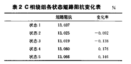 由表2可見, C相繞組在5種狀態(tài)下的短路阻抗偏差極小,較大偏差不超過1%。根據(jù)GB1094.1-1996規(guī)定,短路阻抗法所得結(jié)果為本次測試所有繞組狀態(tài)良好,未出現(xiàn)繞組變形。這與試驗(yàn)故障設(shè)定不符,可見短路阻抗法在本次試驗(yàn)中無法判斷繞組故障。