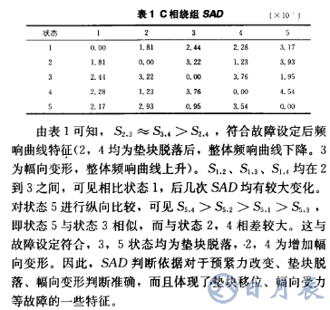 該判據(jù)考察兩組曲線之間的標(biāo)準(zhǔn)偏差。由于計(jì)算中使用了偏差的平方和,而對(duì)于現(xiàn)在VFRA頻響數(shù)據(jù)的特點(diǎn)(高頻幅值大于低頻)來說該判據(jù)對(duì)高頻段考察更為嚴(yán)格。計(jì)算C相的SAD變化表見表1。