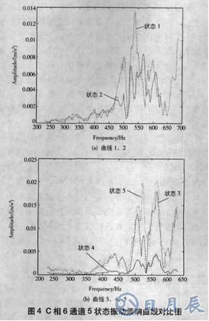 每次狀態(tài)變化時(shí),對(duì)繞組施加115-313Hz幅值為5A的恒流掃頻激勵(lì), C相6通道5狀態(tài)振動(dòng)頻響曲線對(duì)比圖如圖4所示。