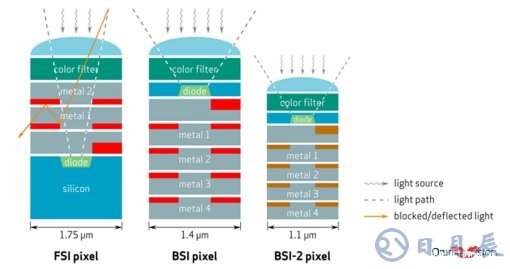 除了BSI,這個行業(yè)還需要其他的改變。在像素縮放中,光二極管(關(guān)鍵的光捕獲元件)在圖像傳感器中收縮,使其效率降低。二極管靠得更近,產(chǎn)生了串?dāng)_。