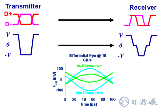 由于玻纖布的相對介電常數(shù)和環(huán)氧樹脂存在較大差異(環(huán)氧樹脂約為3,玻纖布約為6)。因此板面不同位置的介電常數(shù)存在差異,從而導(dǎo)致板面不同位置阻抗的差異。同時(shí),同一阻抗線,由于位置不同,介電常數(shù)也不均勻。對于差分對的影響更為明顯,可能導(dǎo)致眼圖塌陷。