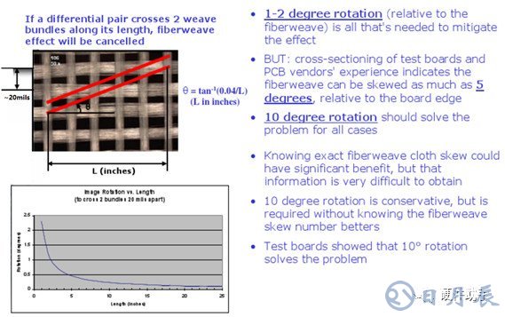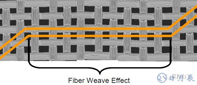 不同的玻纖布,經(jīng)緯紗線的寬度及其間距大小也不一樣,如果按橫平豎直的布線策略,則PCB走線始終與基板邊緣呈0°或者90°,這樣會導(dǎo)致傳輸線方向與玻纖經(jīng)緯向平行,此時(shí)會出現(xiàn)幾種情況:傳輸線在經(jīng)向玻纖束正上方,傳輸線在緯向玻纖束正上方,傳輸線在兩根經(jīng)向玻纖束中間,傳輸線在兩根緯向玻纖束中間。