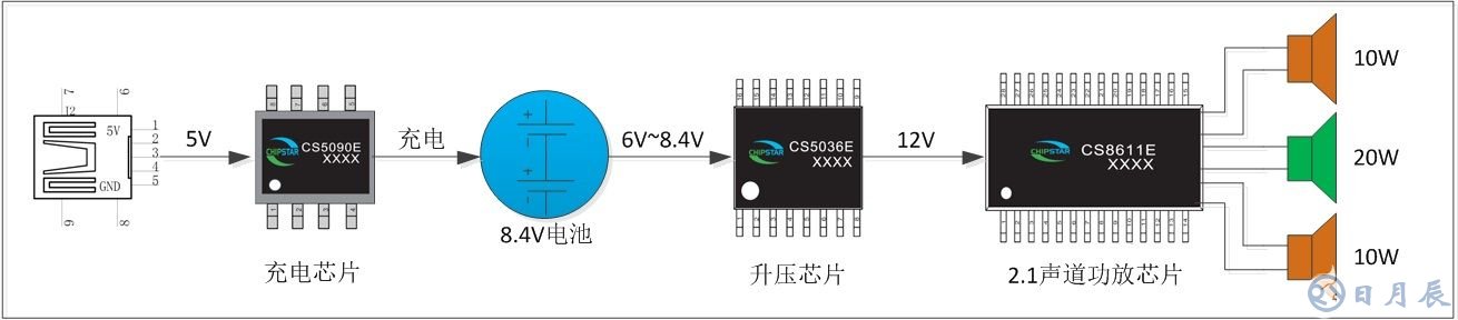 基于CS8611E單芯片移動(dòng)2.1聲道藍(lán)牙音箱解決方案采用雙節(jié)鋰電池串聯(lián)8.4V做電源,再加一個(gè)升壓芯片CS5036E升壓到12V給CS8611E供電,實(shí)現(xiàn)20W+2×10W輸出;而充電采用CS5090E USB 5V輸入兩節(jié)鋰電池串聯(lián)8.4V充電管理芯片,非常方便。在鋰電池為電源的狀態(tài)下提供媲美傳統(tǒng)2.1音箱的聽覺體驗(yàn)。