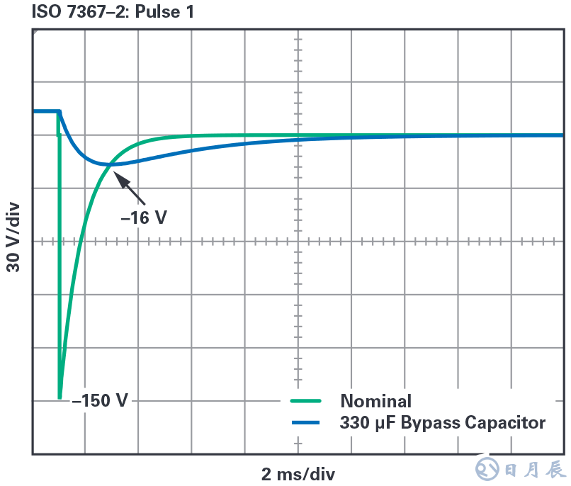 圖1.ISO 7367-2:帶和不帶330 μF旁路電容的脈沖1。