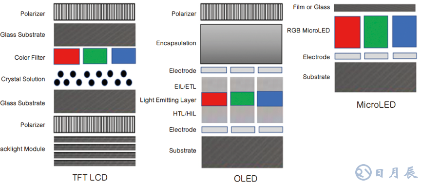圖1:薄膜晶體管LCD、OLED和microLED顯示器結(jié)構(gòu)比較。