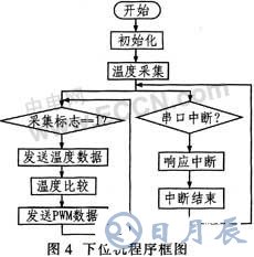 下位機程序框圖如圖4所示。系統(tǒng)上電后,下位機程序可使單片機不停地采集溫度,當上位機向下位機發(fā)出命令置位采集標志位時,下位機采集的溫度送到上位機的面板并顯示,再將所采集的溫度數(shù)據(jù)同預(yù)先所設(shè)定的溫度值相比較,當采集的溫度小于設(shè)定溫度時,根據(jù)采集的溫度值跟設(shè)定溫度差值的大小,單片機的P10~P15引腳輸 出6路PWM,通過光電隔離TLP521-2和RC濾波電路控制可控硅模塊的輸入控制電壓,改變可控硅模塊的導(dǎo)通角,從而改變輸出功率。隨著采集到的溫度值越來越接近設(shè)定溫度值,單片機輸出的PWM值越來越大,導(dǎo)通角越來越小,輸出的功率也相應(yīng)變小,直到采集的溫度等于設(shè)定溫度時,導(dǎo)通角完全關(guān)斷。同時下位機也可隨時響應(yīng)串口中斷,便于用戶通過上位機設(shè)置或修改設(shè)定溫度和控制范圍。