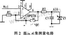 溫度采集測量部分采用高精度、重復(fù)性好、應(yīng)用廣泛的PT100作為采樣電阻;信號放大部分采用低功耗、低輸入失調(diào)電壓、線性好的OP07A;A/D模塊采用8051F350內(nèi)部的高速率24位A/D轉(zhuǎn)換器。溫度采集測量電路如圖2所示,圖中PT100是高精度溫度傳感器,Z1是