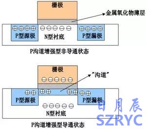 上圖僅僅是原理性的,實際的元件增加了源-漏之間跨接的保護二極管,從而區(qū)分了源極和漏極。實際的元件,p型的,襯底是接正電源的,使得柵極預(yù)先成為相對負電壓,因此p型的管子,柵極不用加負電壓了,接地就能保證導(dǎo)通。相當(dāng)于預(yù)先形成了不能導(dǎo)通的溝道,嚴(yán)格講應(yīng)該是耗盡型了。好處是明顯的,應(yīng)用時拋開了負電壓。