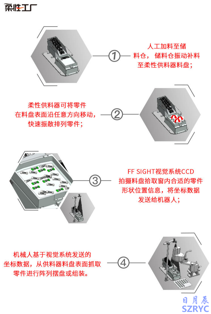 2.然后柔性供料器可將零件在料盤表面沿任意方向移動(dòng),快速振散排列零件;