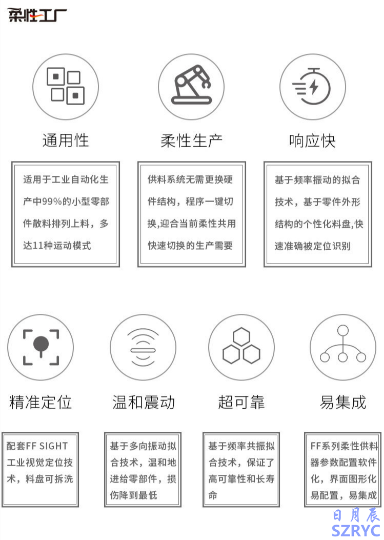 柔性振動(dòng)盤是一種適用于工業(yè)自動(dòng)化生產(chǎn)中99%的小型零部件散料排列上料的,它又叫柔性上料盤、柔性振盤、柔性供料器等。弗萊克斯柔性振動(dòng)盤有五種規(guī)格,分別是FF100-FF500,能夠解決大小不一,材質(zhì)不一以及異形類的零部件產(chǎn)品的上料問題。在當(dāng)代的快速發(fā)展階段,有些會(huì)要求頻繁切換物料生產(chǎn),而弗萊克斯的柔性振動(dòng)盤具有共用性,其供料系統(tǒng)無需更換硬件結(jié)構(gòu),程序一鍵切換生產(chǎn)品種,迎合了當(dāng)前智能制造小批量、多品種的柔性生產(chǎn)需要。無卡料,不損失產(chǎn)品,質(zhì)量好的柔性供料器都是大家所想要的。俗話說得好:貨比三家,大家不妨來看看弗萊克斯的柔性振動(dòng)盤,它有什么優(yōu)勢以及它的工作原理又是怎樣的?